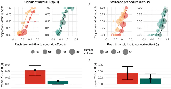 Temporal recalibration is a fascinating phenomenon. If one (experimentally) induces a consistent artificial delay between an action (e.g., pressing a button) and a visual stimulus (e.g., the light turning on), then - after a few exposures - stimuli occuring at shorter delays may well appear as if they happened even before the action was executed. In this piece Wiebke shows temporal recalibration across a good range of visual conditions with not only real but also simulated saccades.